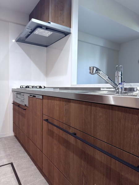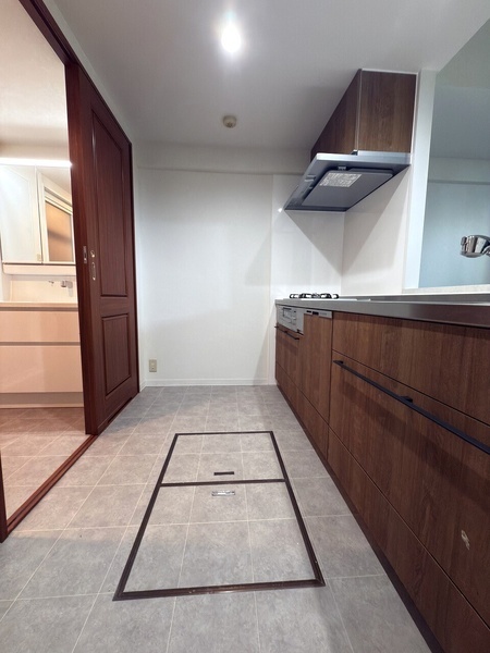 吊戸棚を撤去し、圧迫感を解消。明るい開放的なキッチンを実現しました!床の点検口も目立たなく工夫しました。木目調の落ち着いたデザインとステンレスの清潔感で、快適な空間に生まれ変わりました。