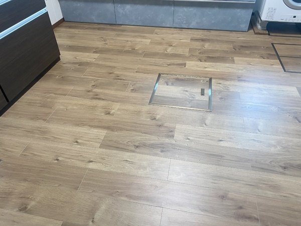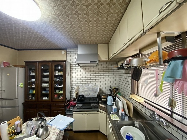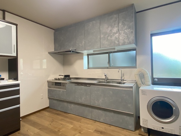 掃除がしやすいフラットタイプのレンジフード「とってもクリンフード」をご提案。 床の表面が傷んでいるので、段差にも影響のないフロアー材を使用して、綺麗に仕上がりました。 壁紙も変えて明るいキッチンになりました。