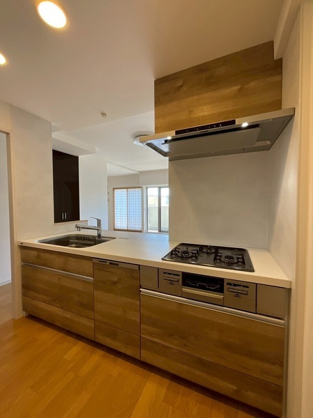木目調のお洒落なデザインを採用。上部の吊戸棚を撤去し、開放感のある広々とした空間を実現しました。調理中もリビングとの一体感があり、家族との会話も楽しめます。