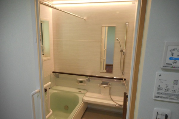 施主さまの要望により水周りの集約と同線を集中させるため離れの浴室から家の中に新たに施工させてもらいました。アクリア1616