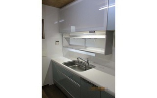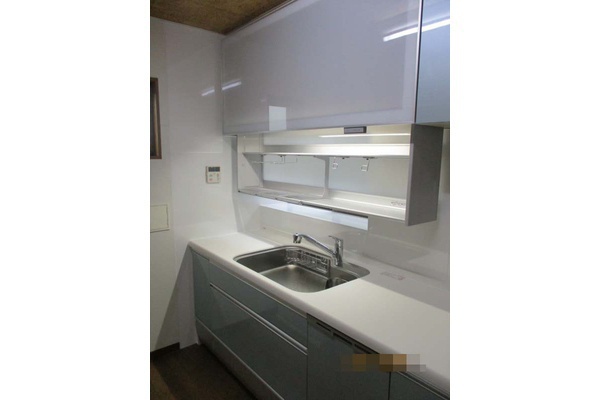 キッチンの入れ替えをしました。必要な部分だけ最小限の解体工事を行い、タイルの壁をキッチンパネルにしました。置き型の食洗機は内蔵し、電動昇降型の収納も設置し、すっきりとしたキッチンを実現しました。
