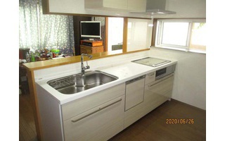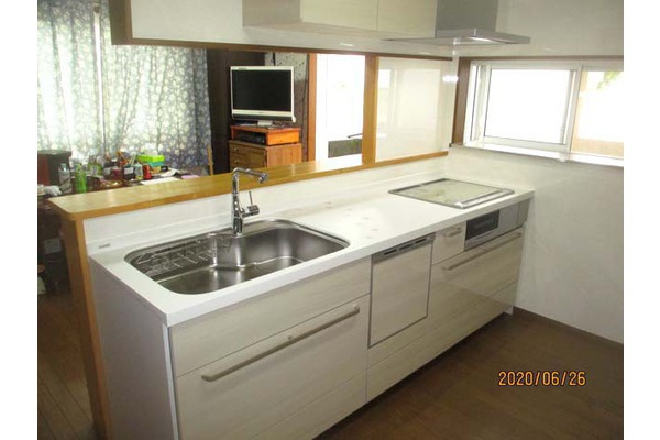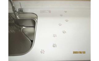 I型キッチンにすることで、奥の方にあった家電収納をキッチン後ろに持って来る事が出来、動線が短くなりました。 またワークトップの動物の足跡の柄を気に入っていただけました。