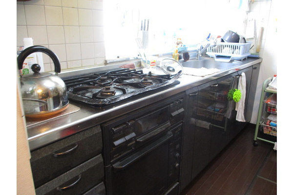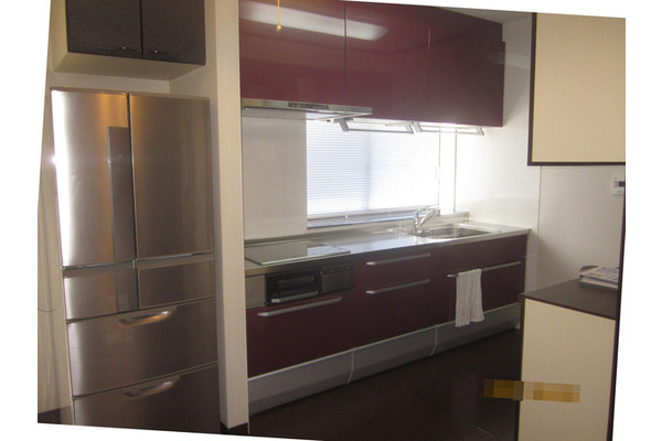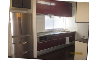 クリナップ クリンレディーを設置しました。 元あった袖壁にぴったり納めました。 扉の色はルナレッドをお選びいただき、高級感のある仕上がりになりました。