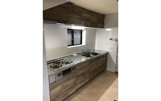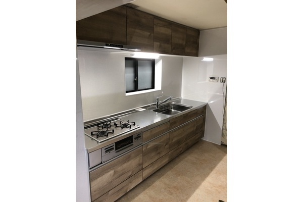 収納力がありスッキリとしたデザインのステディアをご提案。コンロは置型からビルトインタイプになり、レンジフードもスッキリとしたデザインの物に。また、壁のタイルもキッチンパネルにし、お手入れしやすくキレイが続くキッチンに。