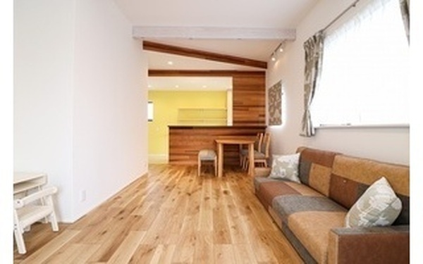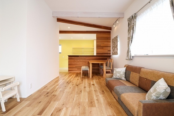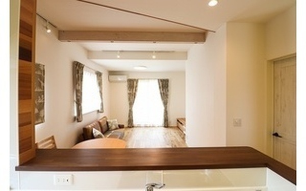 親子であってもプライバシーが守られるよう、極力水廻りを分けました。小さいお子様に目が届くよう、LDKは縦長にしています。 キッチンはシンプルにホワイト、それ以外でアクセントになるような内装に仕上げています。