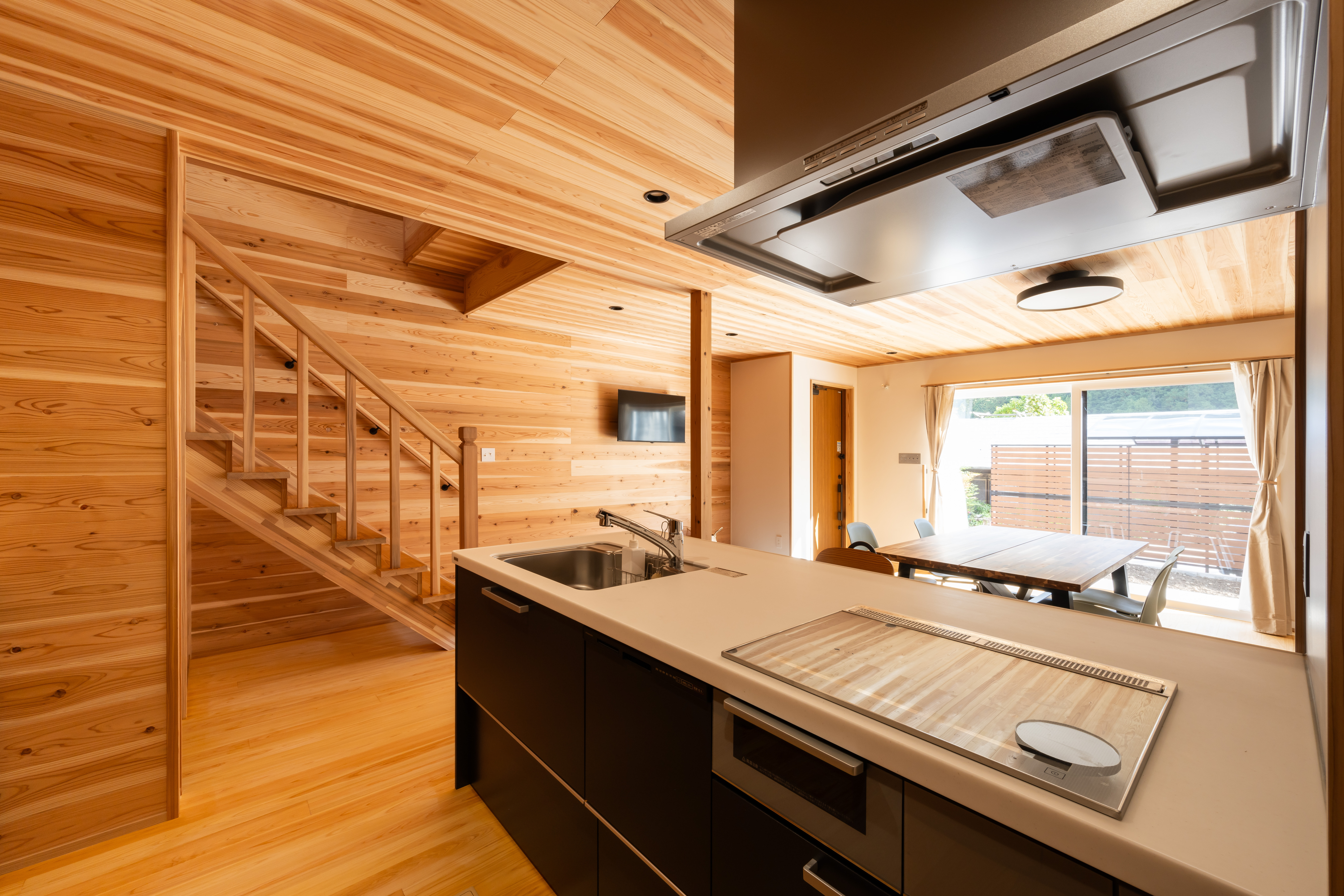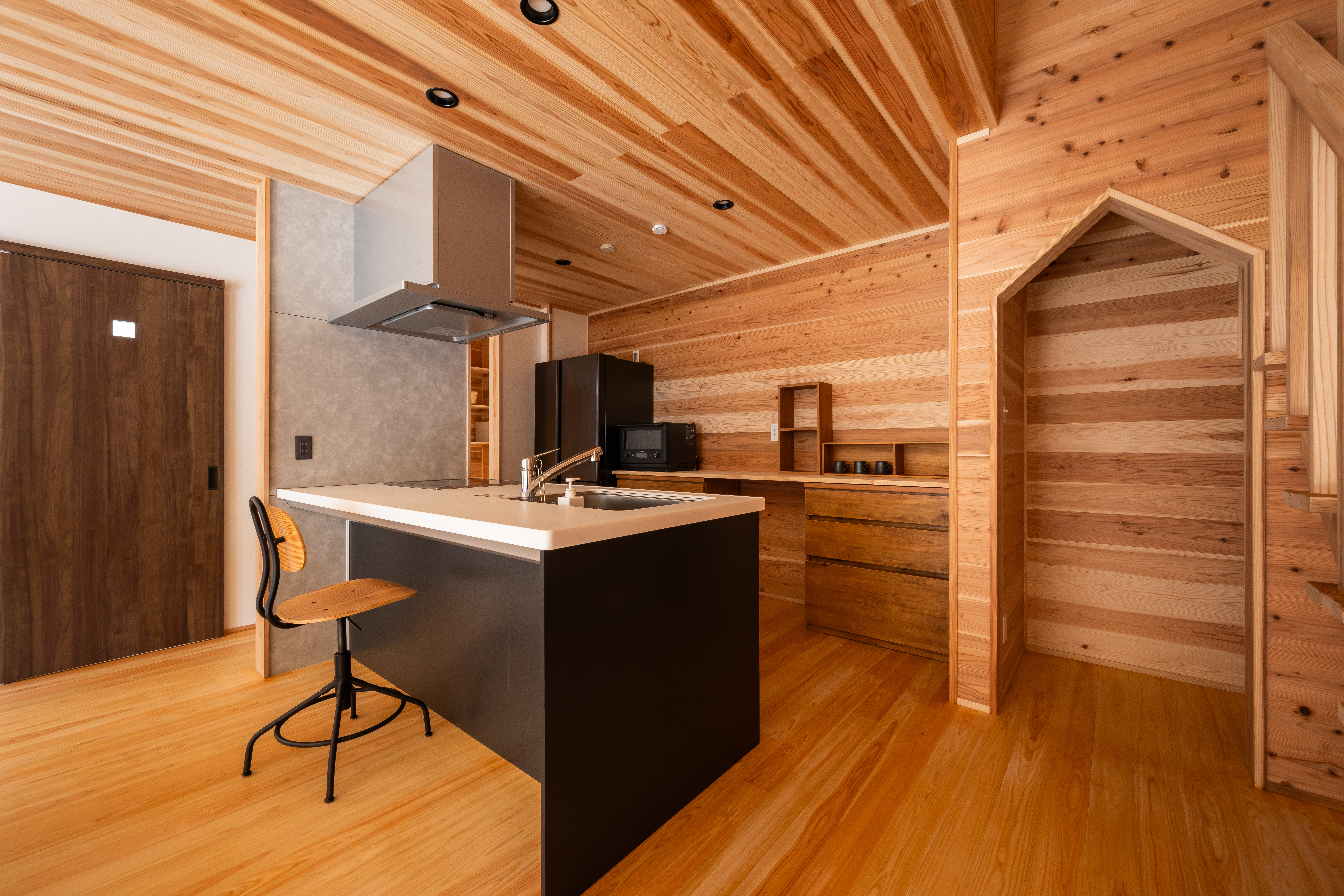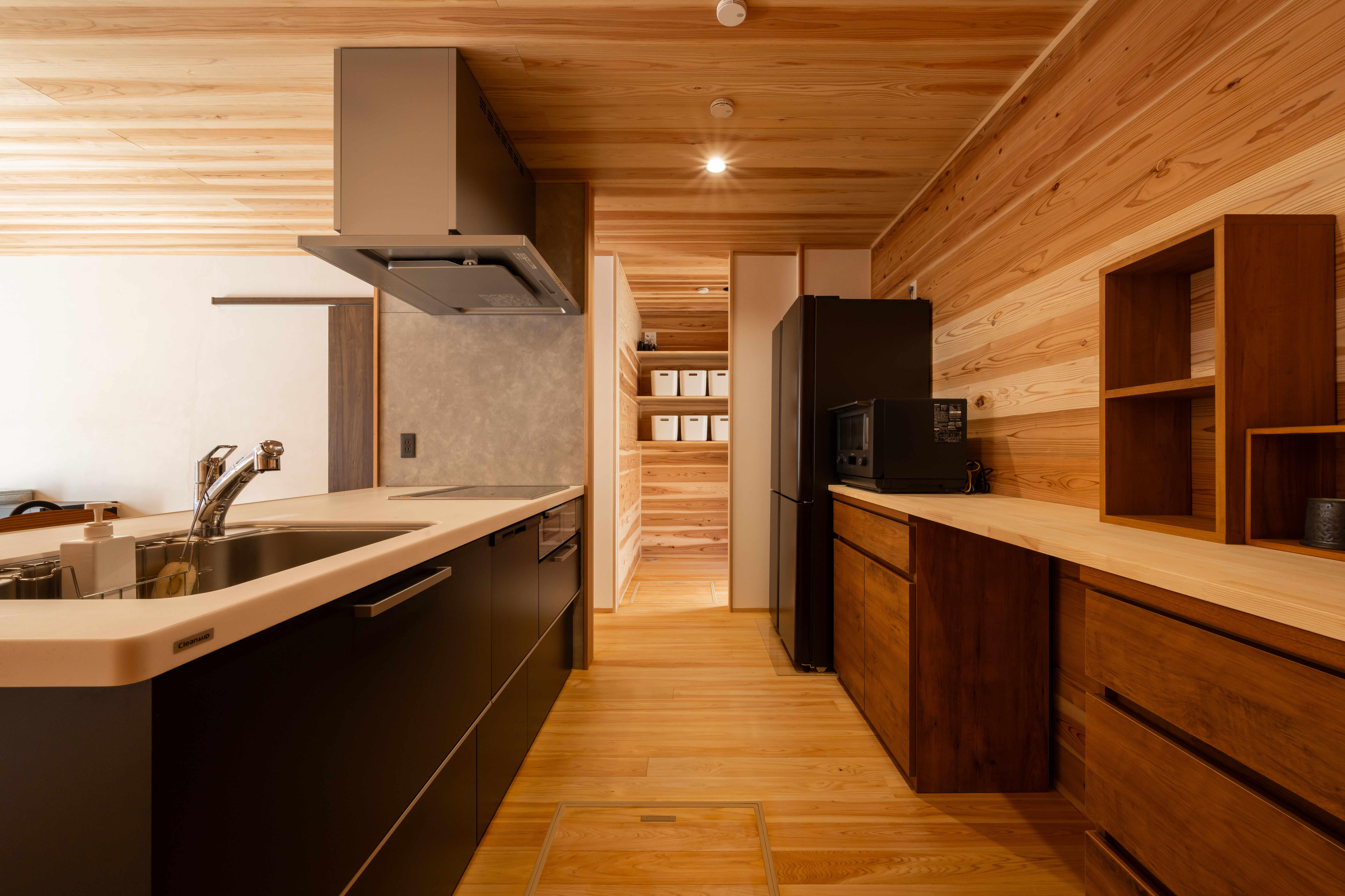 ご主人様も調理されるとのことで、キッチンは家族みんなで使えるようにフルフラットでご提案。 キッチン前にはカウンタースタイルでLDKにいるご家族とも会話が弾む解放感あるキッチンに 統一感を合わせるために、カップボードもキッチンど同メーカーでご提案。