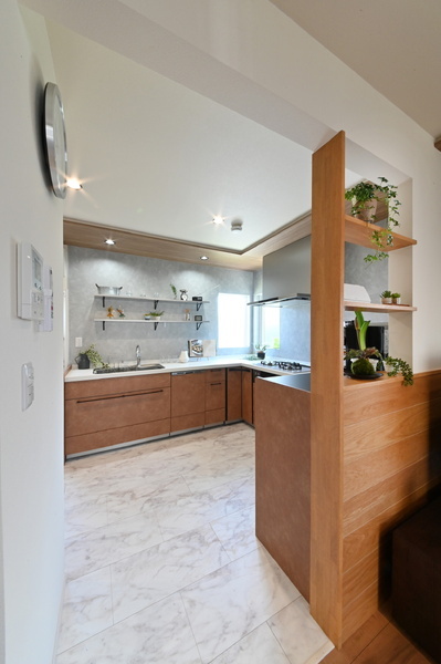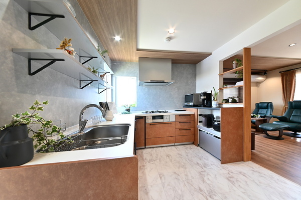 もともとキッチンだった空間をランドリールームにし、お料理が趣味のご主人の為、またご夫婦での作業もストレスが無い、ゆったりとしたキッチンを設けました二人暮らしの為、リビングダイニングはコンパクトに一部屋にまとめ、ご夫婦仲良くパーソナルチェアーでくつろぎの時間を過ごします