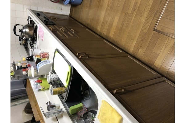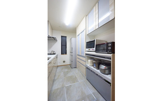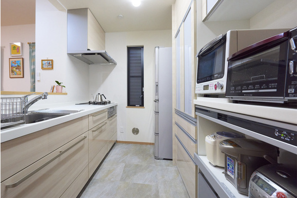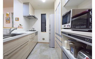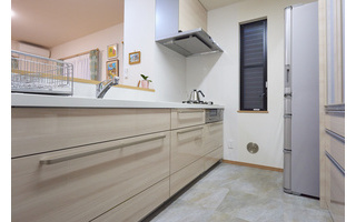 視界を遮っていた下り戸棚を撤去。キッチン本来の収納だけでなく、背面にも収納棚を取り付けることで、常にすっきりした状態を保つことができます。
