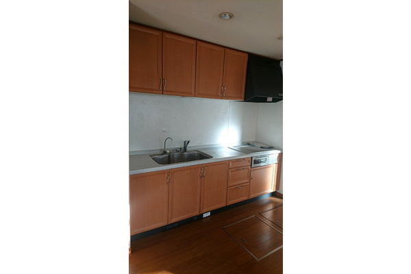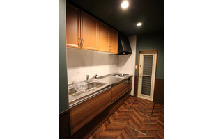 もとのキャビネットはそのままに、ベースキャビネットを一新。全体を木目調にまとめて、温もりあるキッチンに仕上がりました。