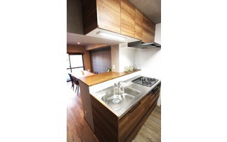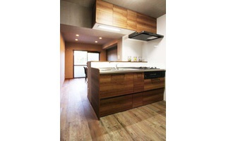 素材感の感じられるヴィンテージ風のキッチンをご提案。I型キッチンにカウンターを造作し作業スペース兼収納に。