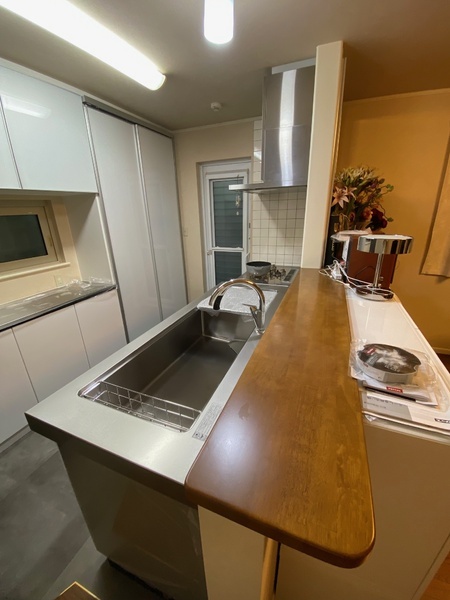 既存キツチン床を、傷の付きにくいフロアタイルに変更。既存フロアとフロアタイルの見切りを真鍮鏡面仕上材を施工致しました。