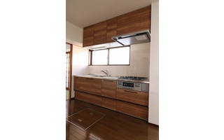 単体キッチンからシステムキッチンへの交換、今流行りの木目感のしっかりでる色を提案しました。