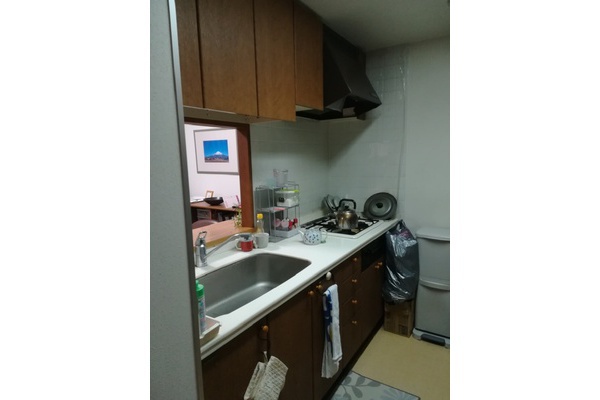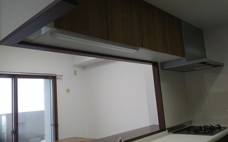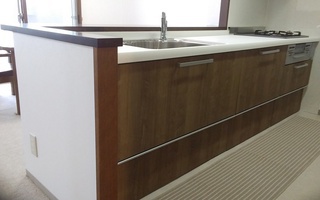 コンロと換気扇の不具合によりキッチン交換。 その際にコーナー収納を撤去して対面カウンターを広げ、明るいキッチンになるように。