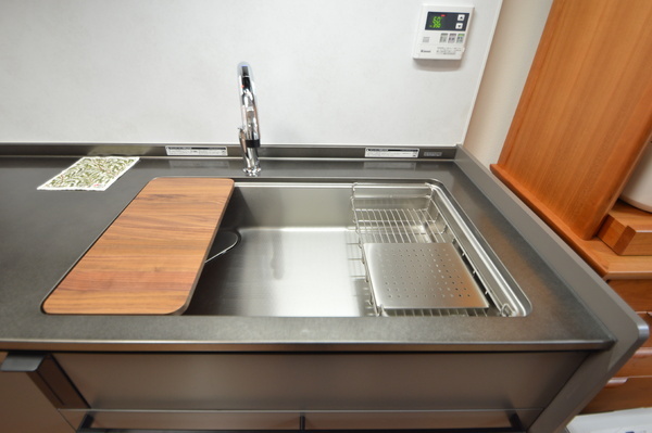 オプションの天然木の木製プレートを置いてやっと理想のキッチンの完成形になりました ステンレス製キッチンの清潔感や収納力はこれを選んでよかった!と感じています