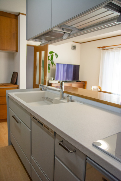 古くなったキッチンを機能性のいいキッチンへ。手動の昇降式吊戸棚で物の出し入れがしやすく、作業効率がアップしました。施工前のキッチンは濃い木目調でしたが、施工後は淡い色合いにすることで部屋全体が明るく感じられるようになりました。
