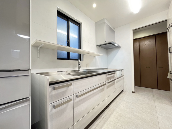 既存の吊戸棚を撤去し、窓の位置を活かした棚板を新たに設置しました。光がより届くようになり明るくスッキリとした印象へ。 カップボードは真ん中の袖壁を撤去することで以前よりも大きなものを。