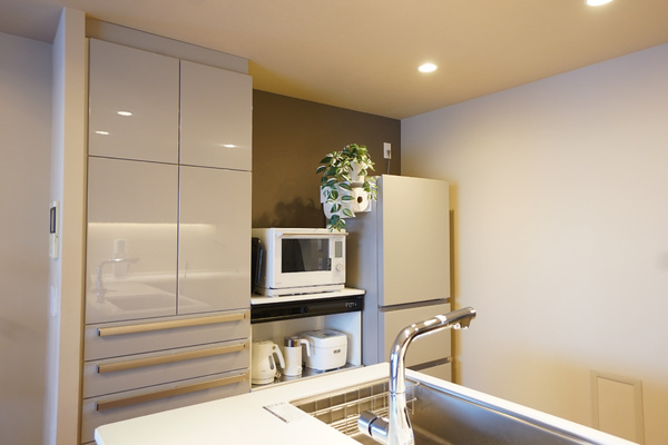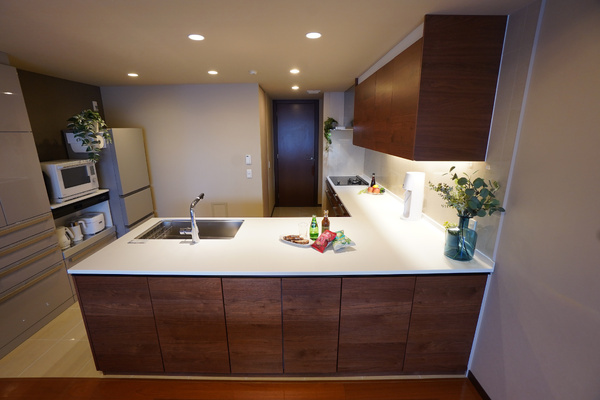 オープンキッチンはインテリアと溶け込む木彫を。ガスコンロとIHクッキングヒーターが1つになっているデュアルコンロで、毎日の調理がより便利に。