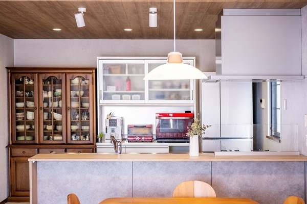 吊戸棚と間仕切り壁をなくし、ダウンライトで仕上げるようにご提案。また、照明もあえてリビングとキッチンを電球色と温白色でわけるように提案させていただきました。