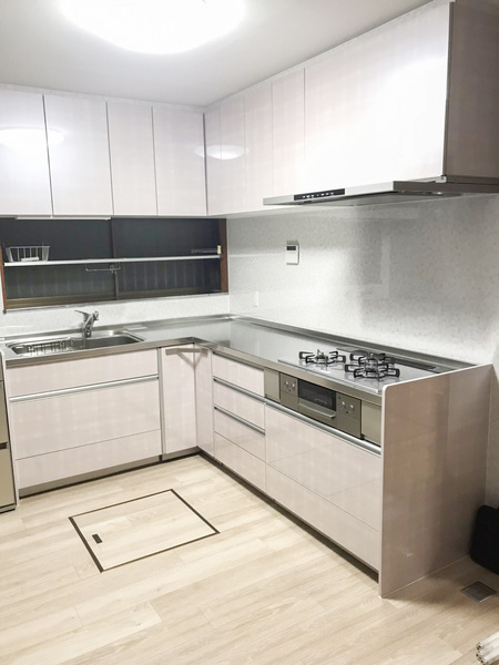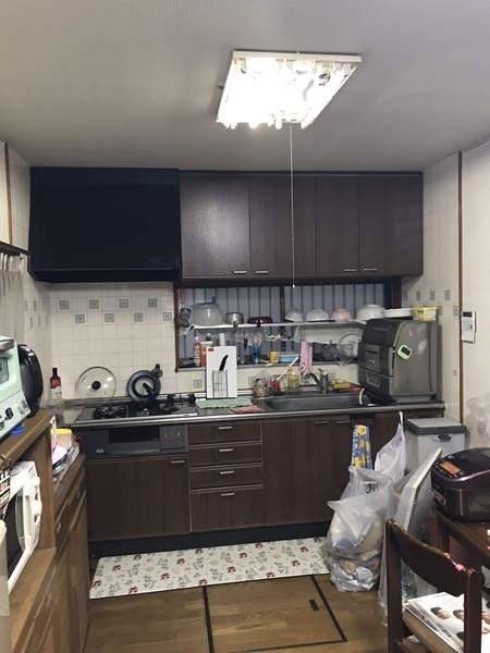 冷蔵庫がキッチンと反対側の壁面にあり、料理の際にかなり苦労されていました。 I型キッチンからL字キッチンへと変更し、冷蔵庫をキッチンの隣に設置することで、導線が改善され、家事負担が以前より改善されました。