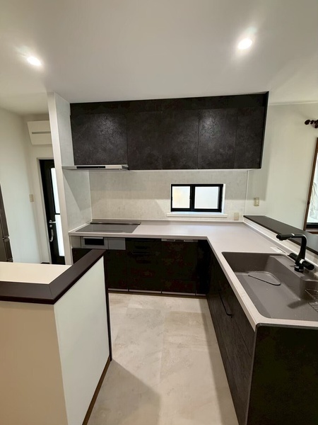 キッチンの吊り戸を無くし腰壁をエンドパネル納めにすることで開放感のあるキッチンをご提案