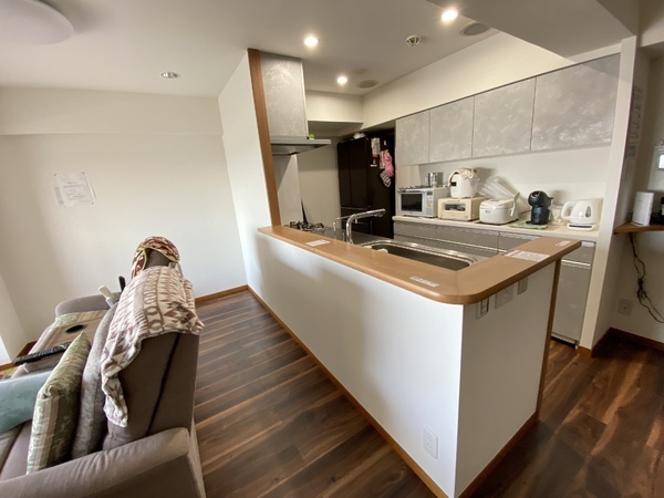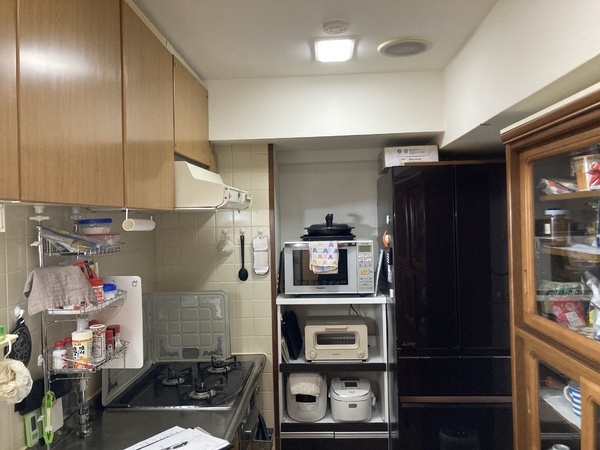 キッチン内部の下がり壁と袖壁を撤去して解放感と明るさを取り入れ、吊戸がなくなったので大きめのカップボードをご提案。